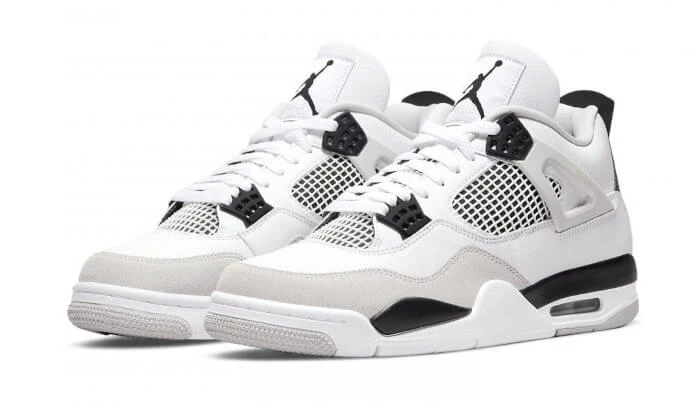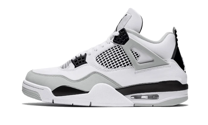 The Air Jordan 4 Military Black follows the structure of the Military Blue OG colour from 1989 and replaces the traditional blue inserts with black on the eyelets and the heel tab emblematic of the Jordan 4. The upper features a white leather upper with grey detailing on the mudguard and wings that adorn the panels. A white sole with black and grey overlays completes the Tinker Hatfield-designed silhouette.