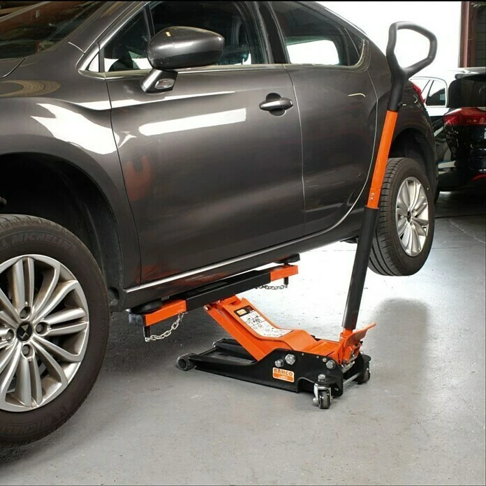 Der Bahco Wagenheber zeichnet sich durch seine niedrige Unterfahrhöhe aus, mit der er auch an tiefergelegten und getunten Fahrzeugen eingesetzt werden kann. Durch das extra große Fußpedal ist eine Nutzung in jeder Position möglich. Der Doppelkolben sorgt für ein schnelleres Anheben und so für eine bis zu 50 % höhere Arbeitsgeschwindigkeit. Der Staubschutz für den Kolben verhindert Verunreinigungen, sodass der Wagenheber eine hohe Lebensdauer erreicht. Hierzu trägt auch das robuste Metallgehäuse bei. Die Gummiauflage auf der Kontaktfläche verhindert das Abrutschen des aufgebockten Objekts und vermeidet Beschädigungen an lackierten Flächen. Zur sicheren Anwendung ist der Wagenheber mit einem Sicherheitsventil versehen, das vor versehentlicher Überlastung schützt. Der Sicherheitsablass sorgt auch bei Volllast für ein sanftes Ablassen, sodass Gefährdungen und Beschädigungen vermieden werden.