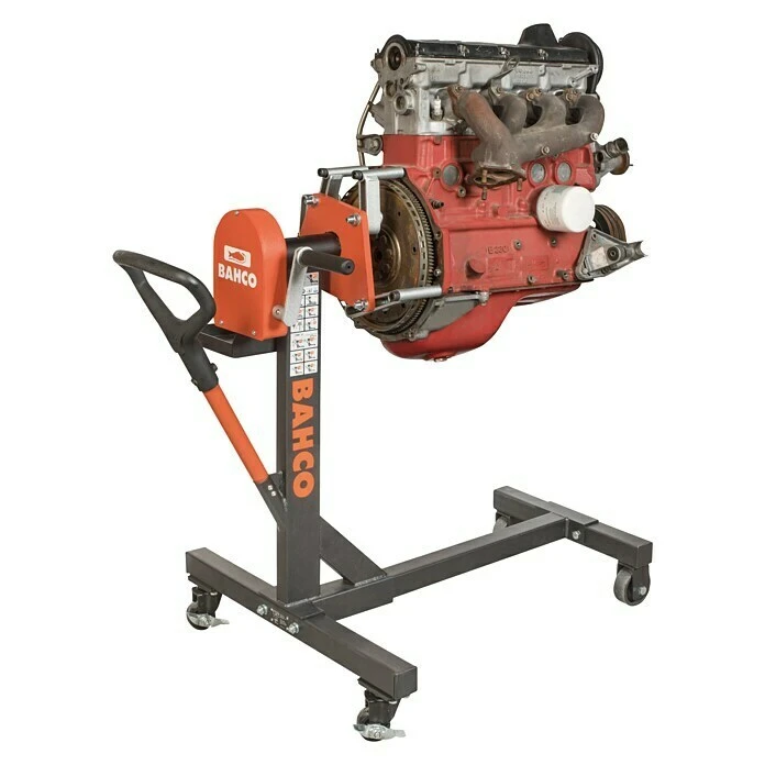 Der Bahco Motorständer mit Getriebe BH8AC2 ist der ideale Helfer für alle Wartungsarbeiten an Motoren und Getrieben. Mit einer maximalen Traglast von 500 kg ermöglicht er den Einsatz mit einer Vielzahl an Motoren. Er bietet ein Übersetzungsverhältnis von 70:1. Durch die schwenkbare Kurbel kann der Motorständer auf die individuellen Bedürfnisse eingestellt werden. Ein ergonomisch gestalteter Griff sorgt für bessere Manövrierbarkeit. Vier bewegliche und verstellbare Sicherungsstifte bieten sicheren Halt. Eine Ölwanne sammelt überschüssiges Öl und hält den Boden sauber. Die Hintere Lenkrollen sind um 360° drehbar und haben eine Feststellbremse. Die praktische Metallschale bietet zusätzlich Platz zum Aufbewahren von Werkzeugen.