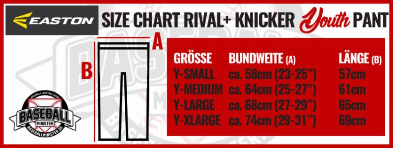 Das Konzept der Rival+ Baseballhosen von Easton ist ganz einfach: Eine bezahlbare, hochwertige Hose mit dem immer gleichen Bund – aber je nach Form mit unterschiedlichen Beinabschlüssen und Längen: