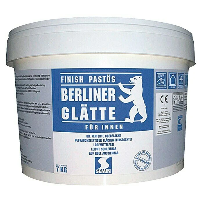 Der Flächen-Feinspachtel Berliner Glätte Finish Pastös ist eine gebrauchsfertige Spachtelmasse zur Herstellung hochwertiger Oberflächen und zur Endbeschichtung (Dünnschichtverfahren/Glättspachtel/Flächenspachtel) der Qualitätsstufen Q2 bis Q4. Darüber hinaus wird das Material zur Erstellung eines spannungsfreien Untergrundes für die nachträgliche farbige Bearbeitung (Anstriche/Lasuren) und als Putzträger für Tapeten oder Spachteltechniken verwendet.