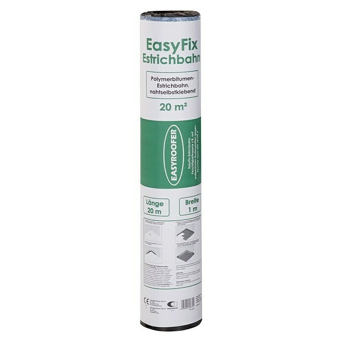 Die Estrichbahn Easy Fix ist eine Aluminiumpolyesterkombination aus Polymerbitumen, die zur Feuchtigkeitsabdichtung unter Estrich-Konstruktionen dient. Sie wird als Feuchtigkeitssperre auf erdberührten Bodenplatten gegen aufsteigende Feuchtigkeit oder als Dampfsperre auf Geschossdecken über bauphysikalischen Räumen eingesetzt. Die Befestigung wird an der Längsnaht, nach Abziehen der silikonisierten Nahtstreifen, auf Ober- und Unterseite verklebt. Die Quernaht wird mit dem Easy Fix Anschlussstreifen überdeckt und verklebt.