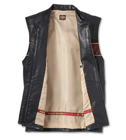 Original Harley-Davidson Herren Lederweste aus der limitierten 120th Anniversary Kollektion. Gefertigt aus mittelschwerem Ziegenleder und mit einem praktischen Stehkragen und einer Innentasche für die wichtigsten Dinge. Die 120th Anniversary Lederweste verkörpert dank ihres kontrastierenden Futters, der Paspelierung und der Einsätze einen gehobenen Stil. Das Beste von allem ist aber, dass sie mit besonderen Details ausgestattet ist, die unserem Erbe Tribut zollen, wie z. B. spezielle Hardware, Etiketten und unser charakteristisches Anniversary Branding.