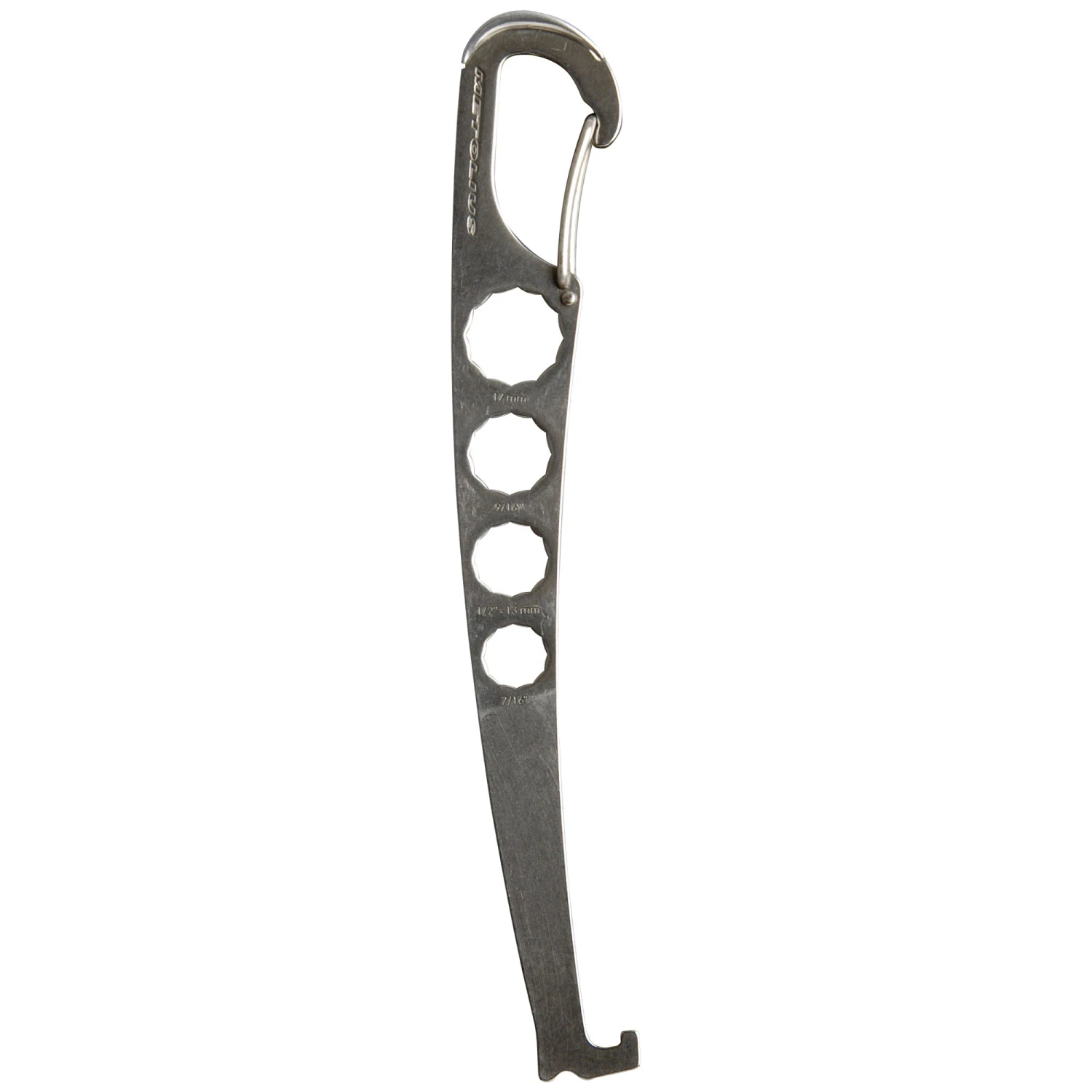 The innovative, ergonomic design of Metolius’ Torque Nut Tool offers all the features you need to get your gear out of the crack and back on your rack! A wire-gate carabiner is built into the handle for ultimate convenience and hardened 420 stainless steel makes this the toughest nut tool you can buy. The business end is precision ground to a thin taper for retrieving the tiniest micro-nuts, and the Torque features a palm protector and built-in wrenches for tightening loose bolts.