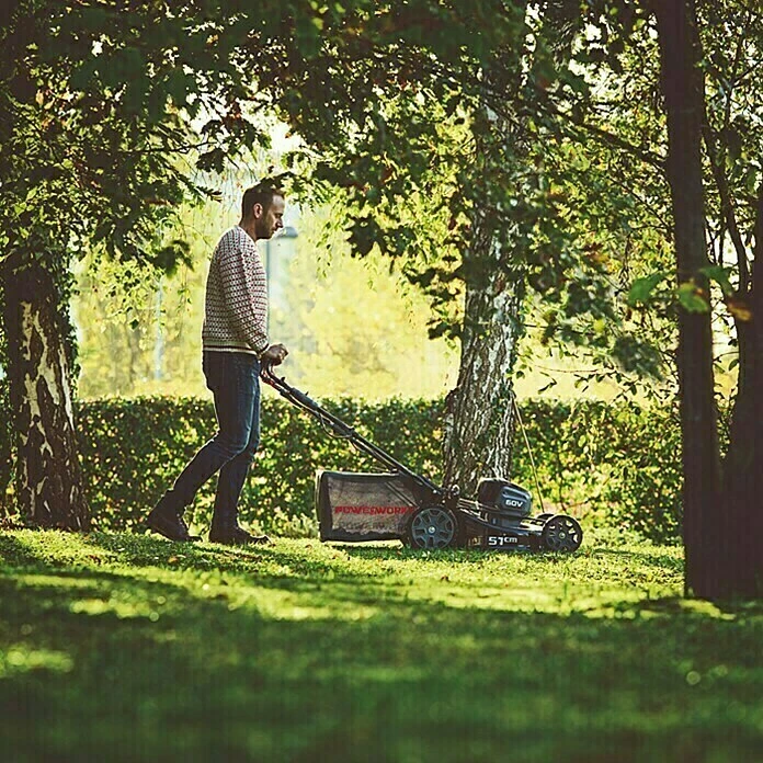 Der Rasenmäher PD60LM51SPK4 von Powerworks ist ein zuverlässiges und leistungsstarkes Gerät, das komplett ohne Benzin und Kabeleinsatz betrieben wird. Sein wartungsfreier, bürstenloser Motor wird durch einen 60 V Akku mit 4 Ah Kapazität angetrieben. So können pro Akkuladung bis 875 m² Rasen gemäht werden. Die Ladedauer des kapazitätsstarken Akkus beträgt nur 120 min – auf diese Art und Weise steht der Mäher nach dem Einsatz bald wieder zu Verfügung. Die siebenfache Höhenverstellung lässt sich zentral bei der Schnittbreite von 51 cm zwischen 25 und 80 mm einstellen. Das Schnittgut kann entweder in dem voluminösen Korb aufgefangen werden, der hierfür ausreichend Platz für bis zu 55 l Schnittgut bietet, oder beim Mulchmähen zerkleinert und auf der Rasenfläche verteilt werden. Darüber hinaus ist der Mäher mit einem Seitenauswurf ausgestattet.