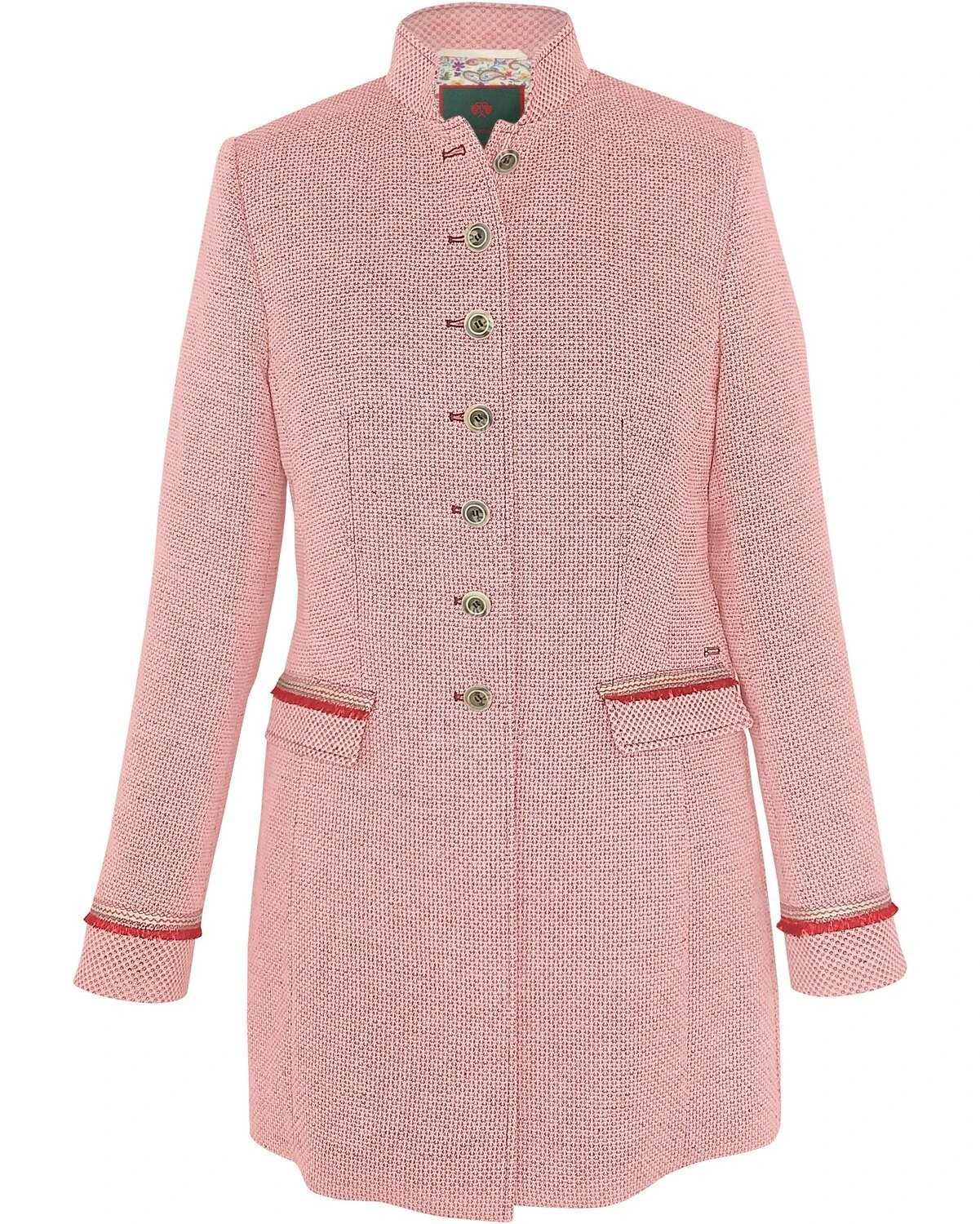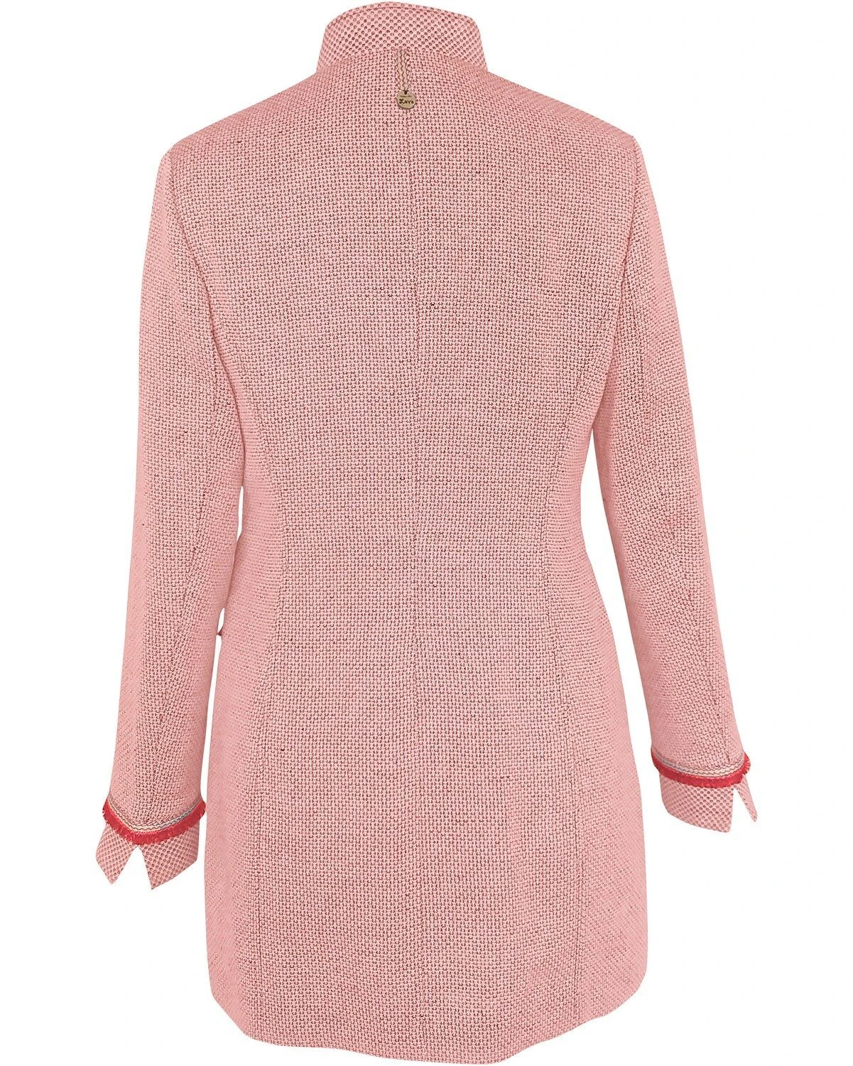Gehrock mit Stehkragen, Pattentaschen und Ärmelsaum in Kontrastfarbe, Dekoband unter den Knöpfen, Fransenband an Ärmelsaum und Taschenpatten und sommerlich leichter Teilfütterung mit Minipaisley-Druck. Oberstoff: 58% Baumwolle, 42% Leinen; Futter: 100% Viskose