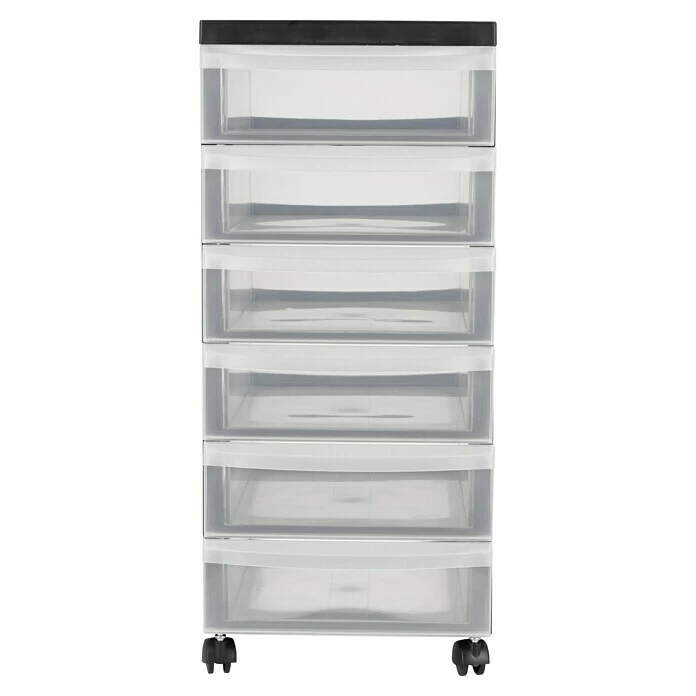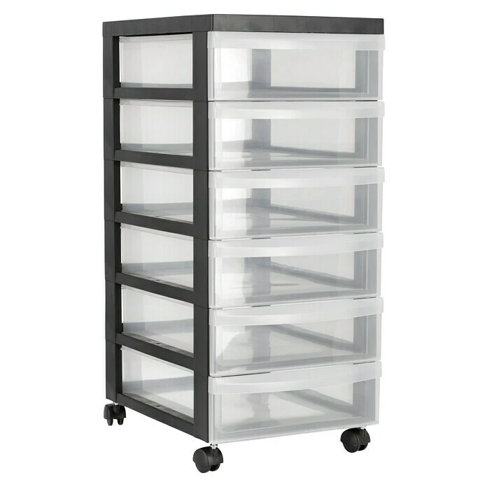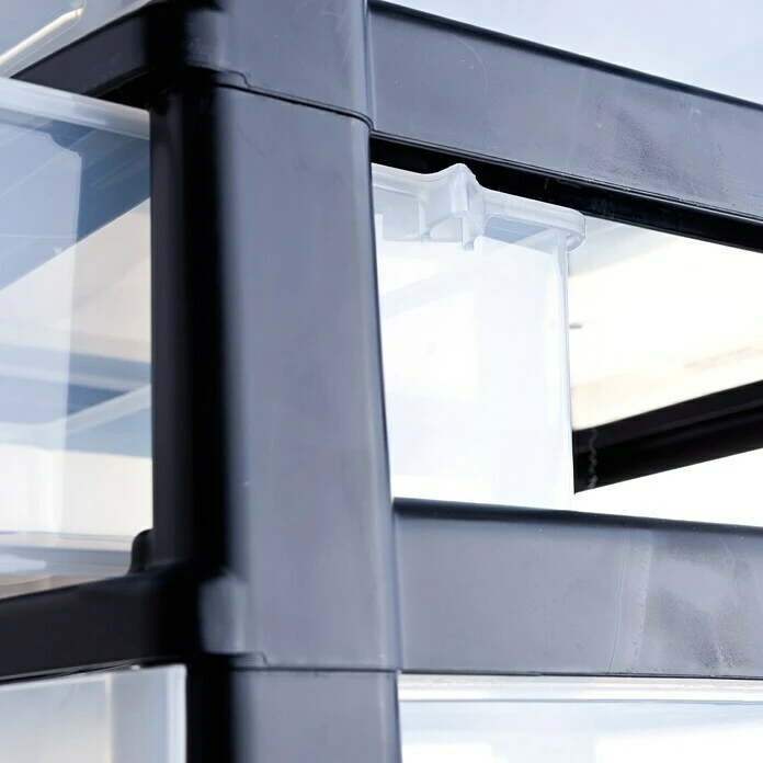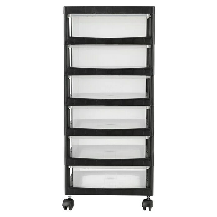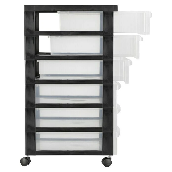 Dieser Kunststoff-Rollcontainer mit leichtgängigen Schubladen ist geeignet zur Aufbewahrung von diversen Utensilien. Der Rahmen ist schwarz und die Schubladen transparent. Der Kunststoff-Rollcontainer verfügt über 4 Rollen, die je nach Bedarf montiert werden können.