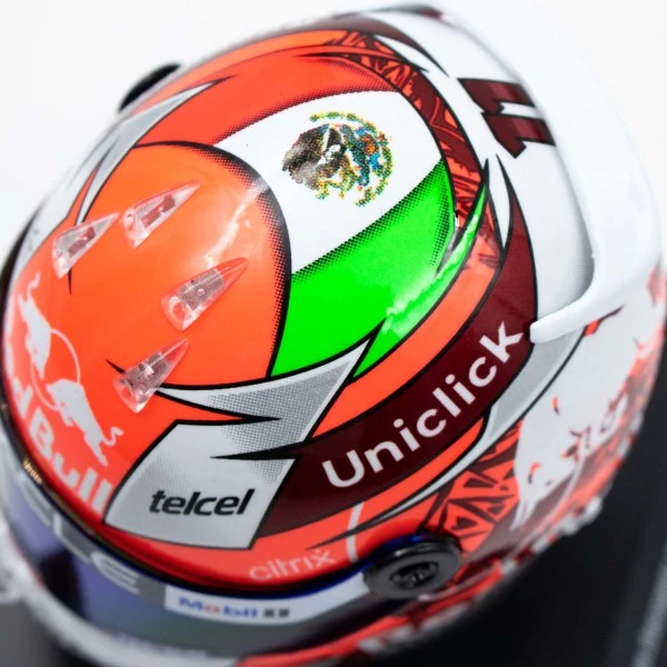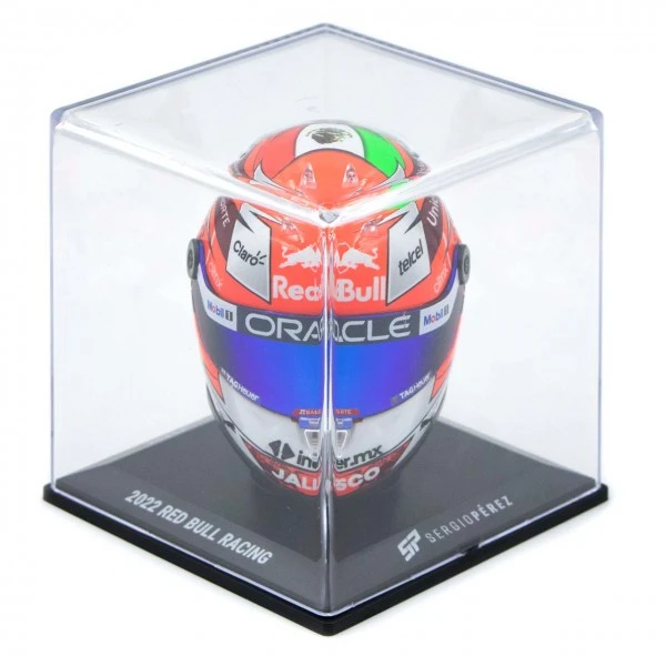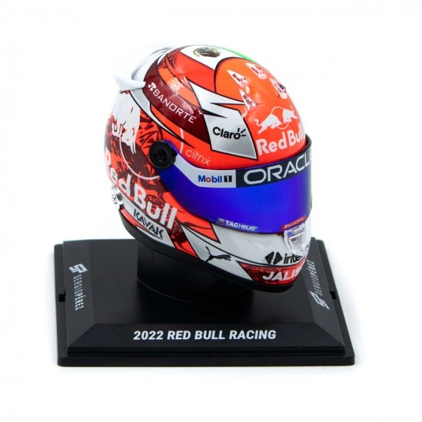 The 1/4 scale miniature helmet is a faithful replica of Sergio Pérez’s driver’s helmet from the Oracle Red Bull Racing Team from the 2022 Formula 1 season, which he wore during the Austrian Grand Prix.