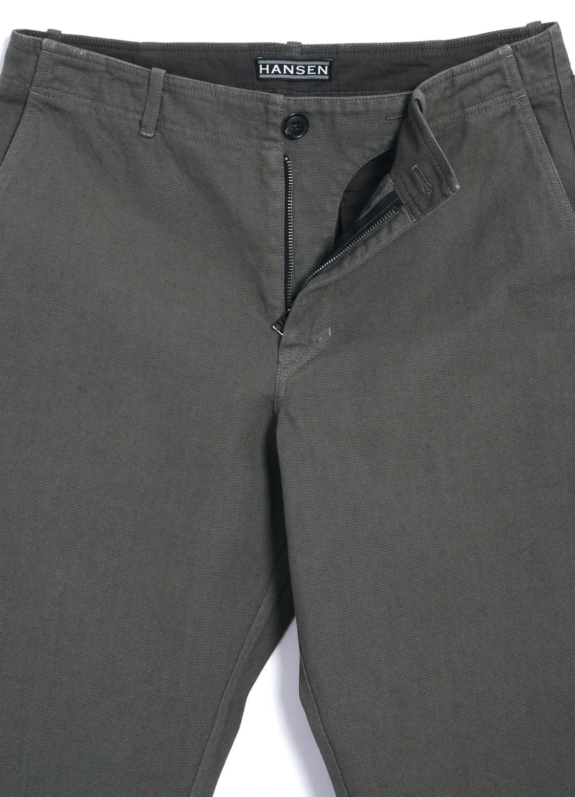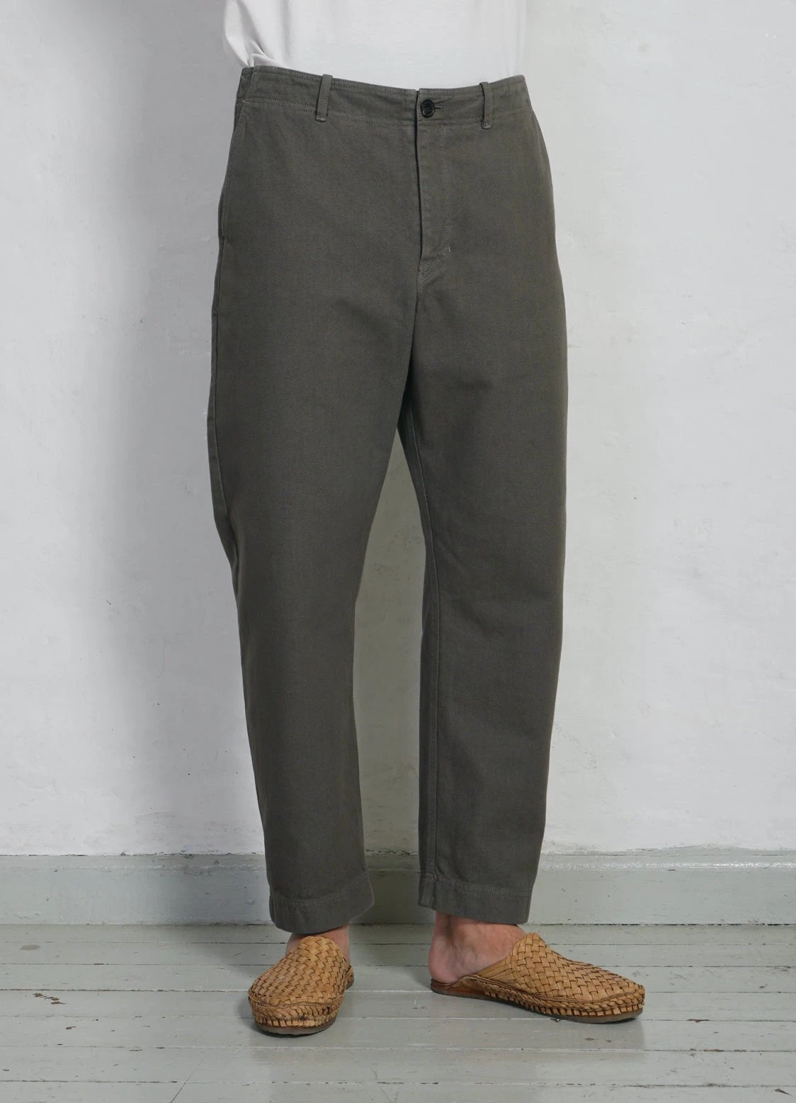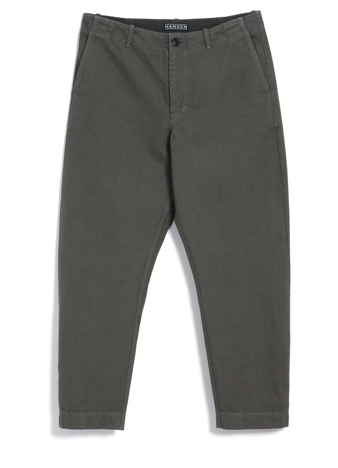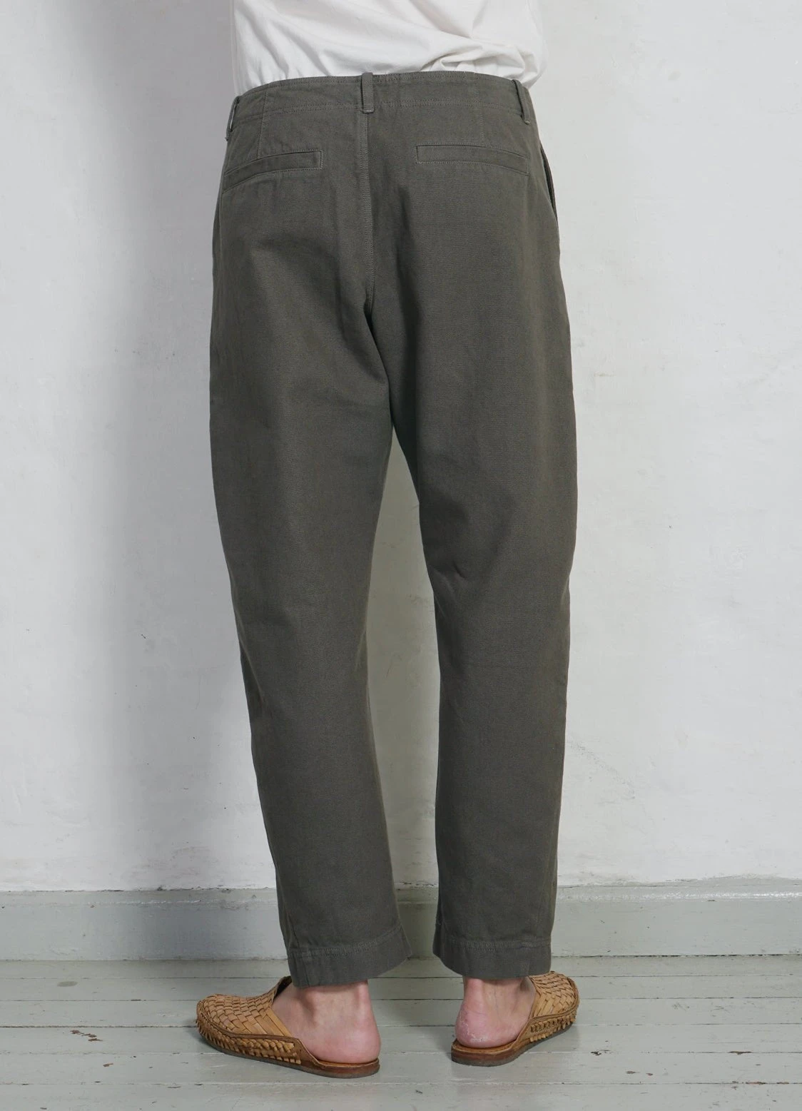 TRYGVE is a pair of loosely fitted, slightly tapered and slightly cropped trousers. It comes with two slanted front pockets, two welted pockets and a zipper fly. The side seams are slightly twisted, giving an organic shape from the knee down.