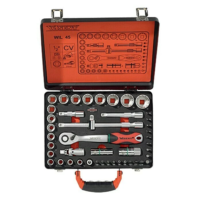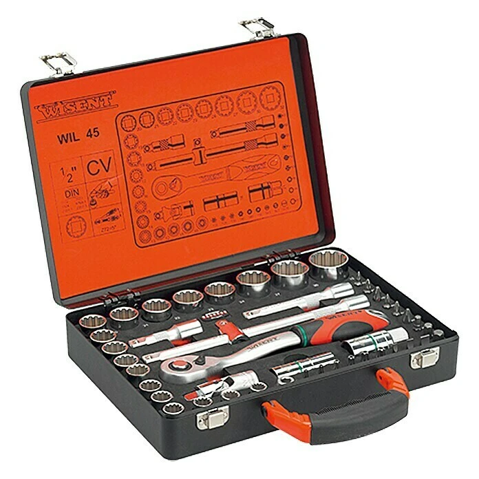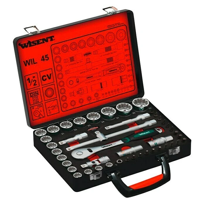 Der Steckschlüssel-Satz WIL 45 von Wisent verfügt über ein zoll-metrisches 12-Zahn-Profil und Nüsse mit Rändelung für eine bessere Handhabung. Der Koffer dieses Sets ist aus stabilem Metall gefertigt und die Steckschlüssel besitzen einen Umschalthebel für rechts/links. Die 72er-Feinverzahnung ist ideal zum Arbeiten in beengten Platzverhältnissen und weist extrem hohe Standzeiten bei Dauerbelastung auf. Der Steckschlüssel-Satz besitzt einen rutschfesten 2-Komponenten-Soft-Griff und eine Verriegelungsmechanik. Das Lösen der Einsätze erfolgt per Knopfdruck.